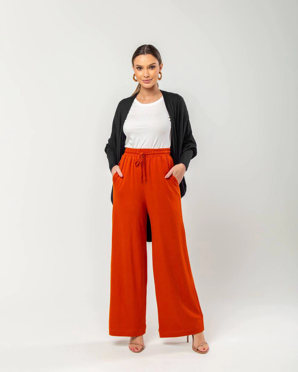 Calça em malha texturizada Estilo Império. Calça curinga para usar com diferentes modelagens de camisas e blusas.